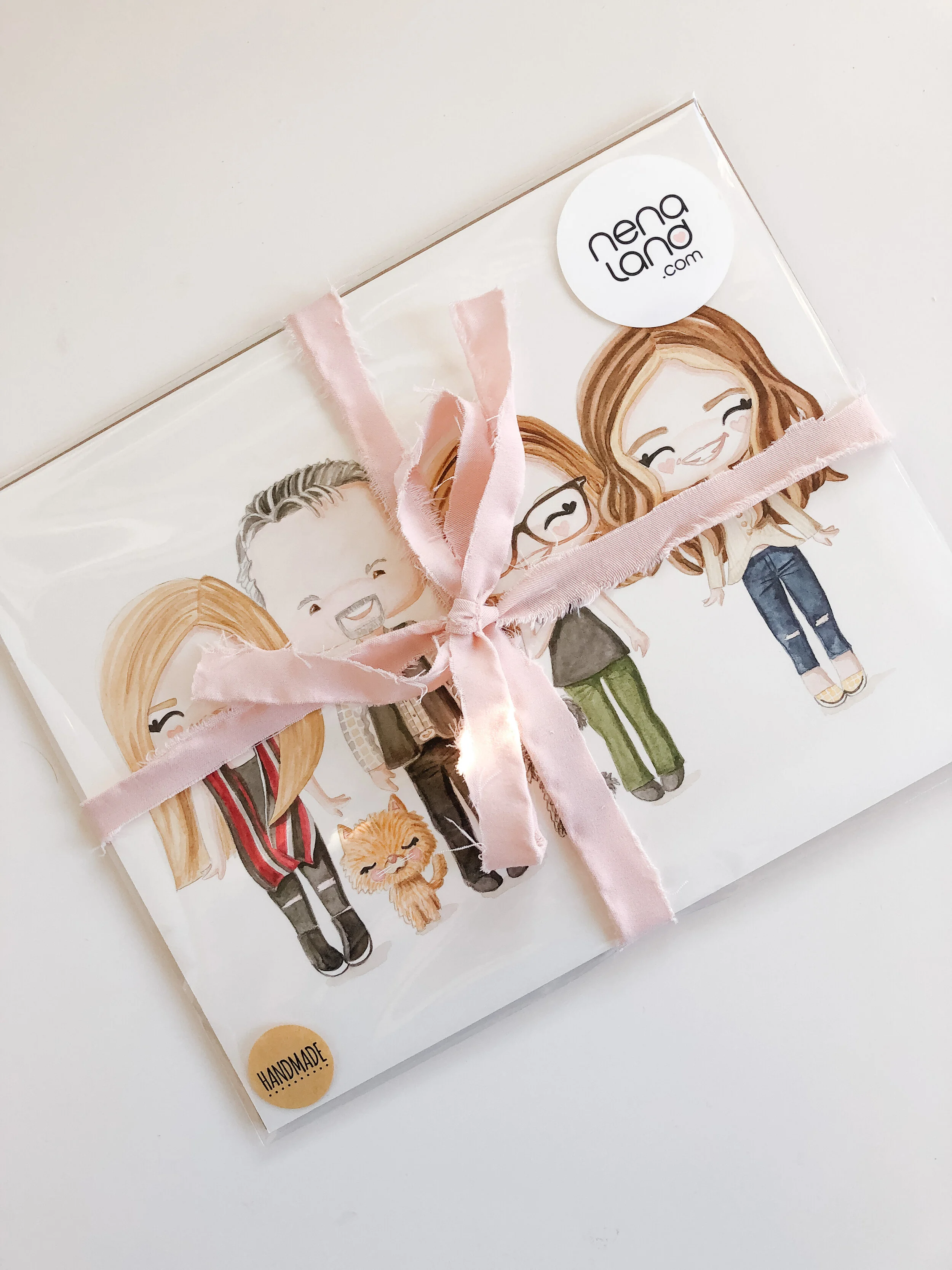 E-mail reference photos to contact@nenaland.com (can be a family photo or individual photos of each person), the wording you would like if is the case.